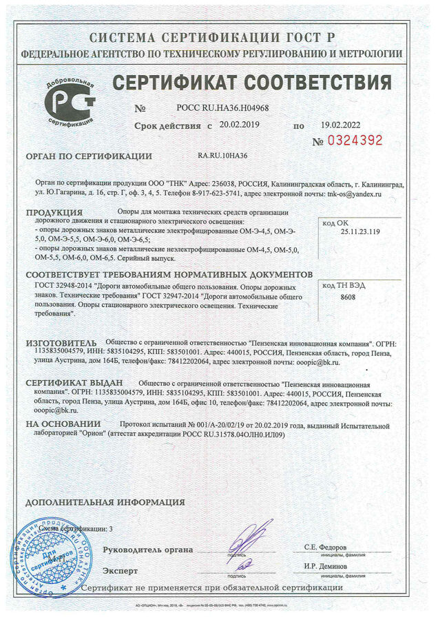 ООО «ПИК» изготавливает металлоконструкции для светофорных объектов и Г-образные опоры для дорожных знаков в соответствии с требованиями ГОСТ 32948-2014 «Дороги автомобильные общего пользования. Опоры дорожных знаков. Технические требования», что подтверждено сертификатами соответствия. Так же конструкции могут изготавливаются на заказ по утверждённым проектам и чертежам. Для их производства задействовано высокотехнологичное оборудование, поэтому качество изделий находится на высоком уровне. Г-образные опоры, светофорные колонки, стойки дорожных знаков, кронштейны для крепления светофоров и дорожных знаков надёжно защищены слоем горячего цинка и имеют длительный срок службы. Опоры укомплектованы метизами и кронштейнами для крепления светофоров и дорожных знаков. В электрифицированных опорах и светофорных колонках предусмотрены ревизионные лючки для проведения электромонтажных работ.